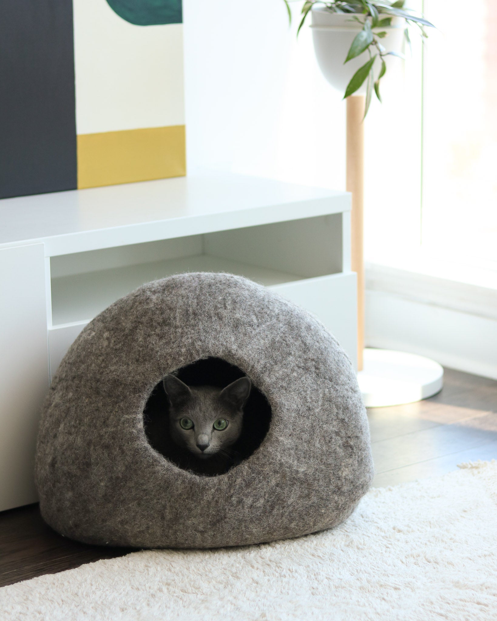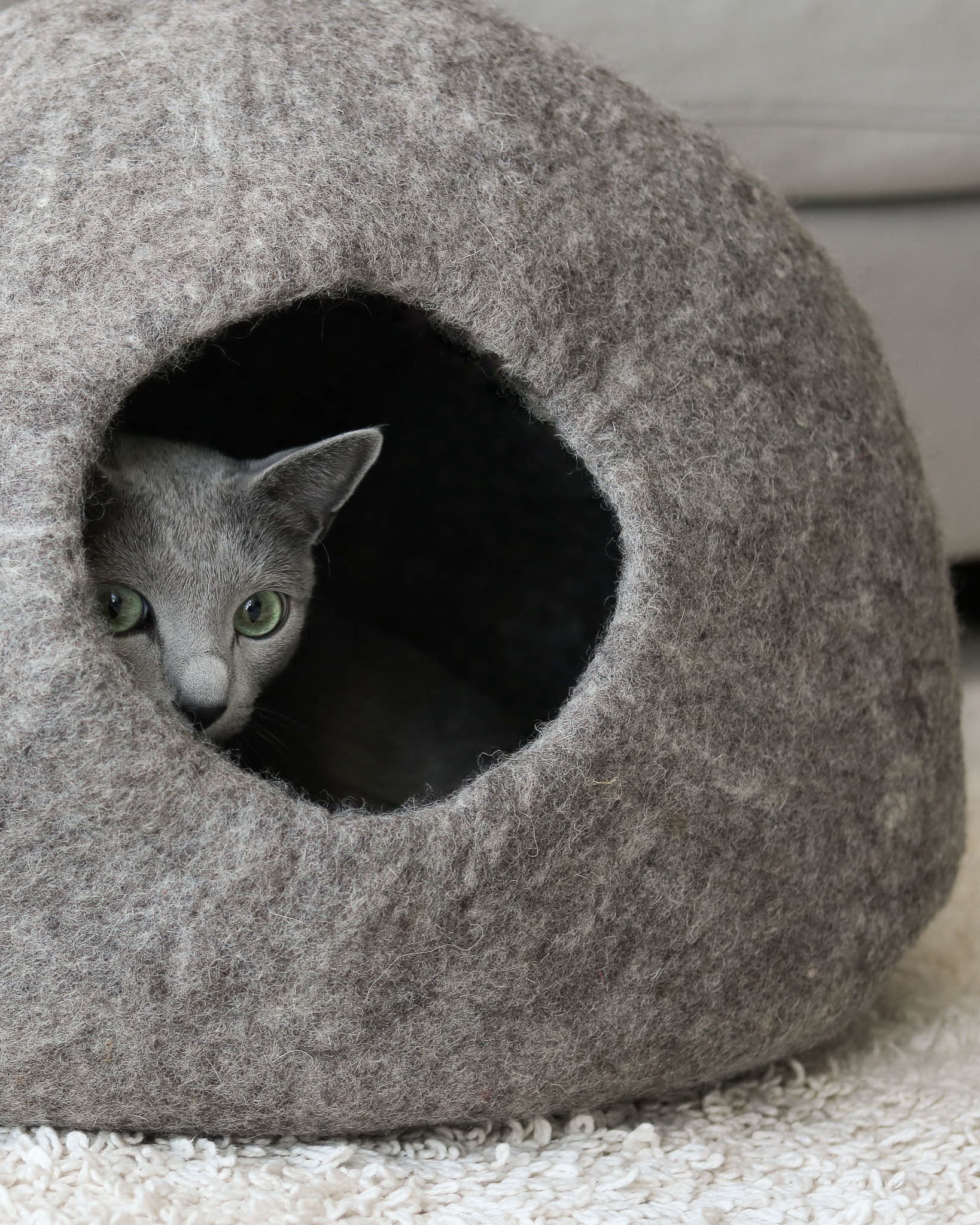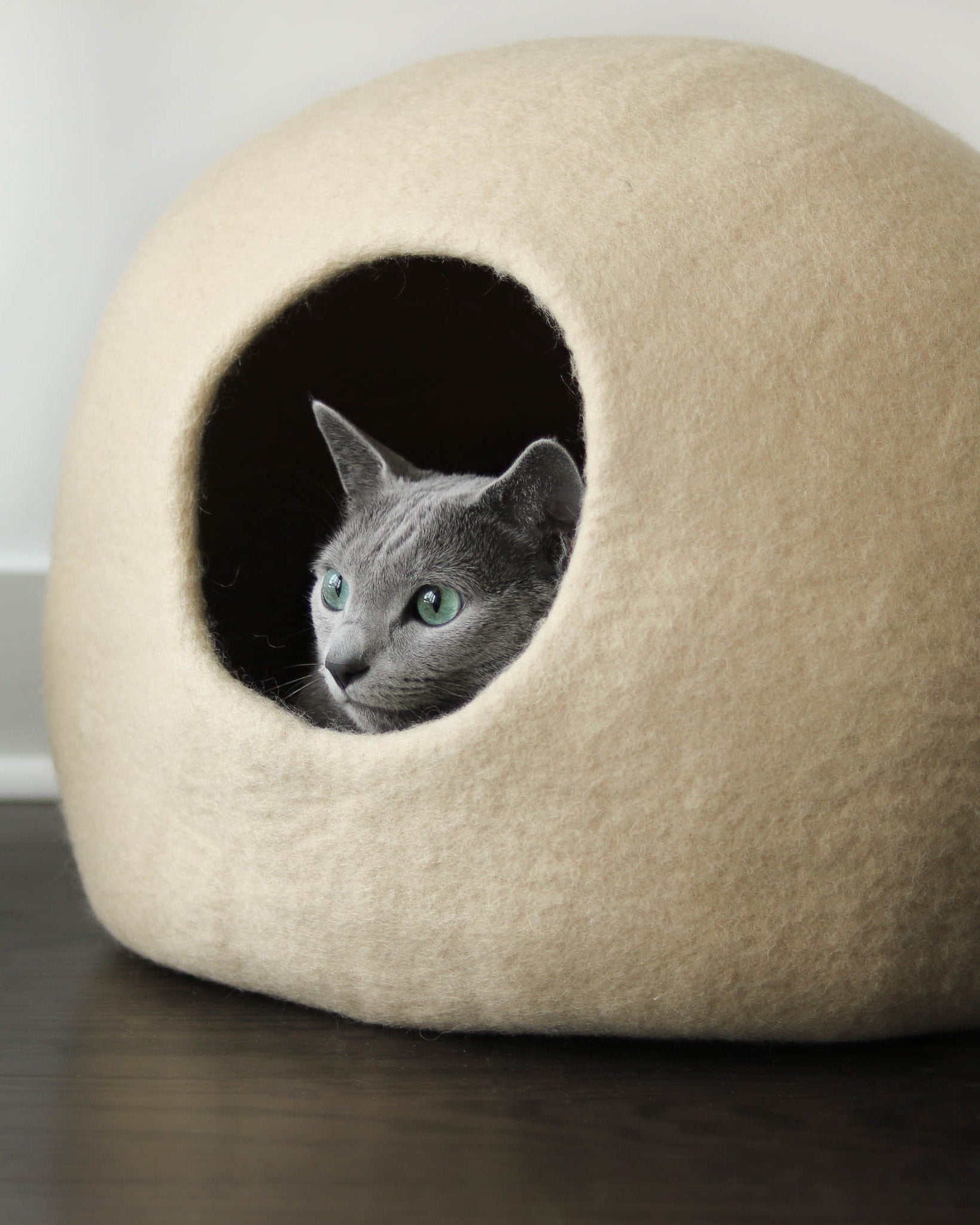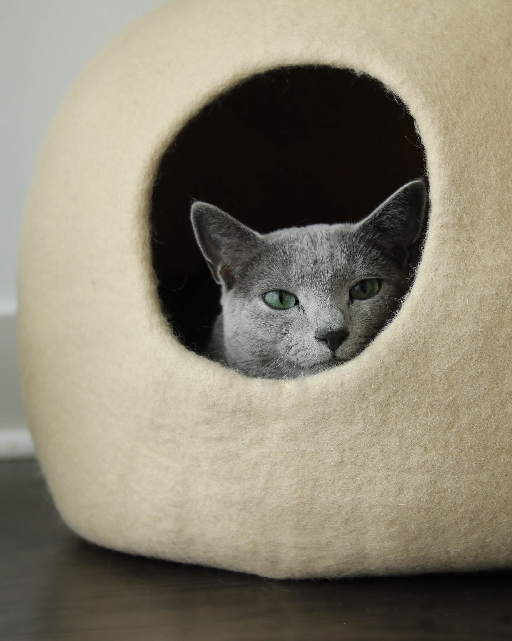 Paz Cat Cave is made from 100% Merino Wool, naturally resistant to odor and stains. These properties are due to the unique characteristics of its fibers, including an antibacterial lanolin coating. We recommend spot cleaning with soap and water if needed. Use a vacuum or lint roller for light cleans.