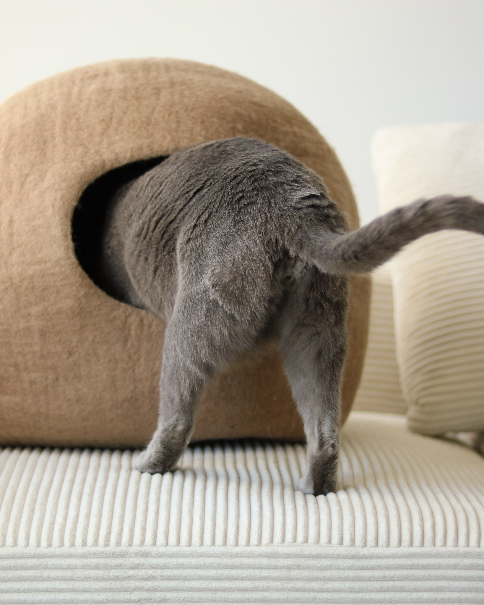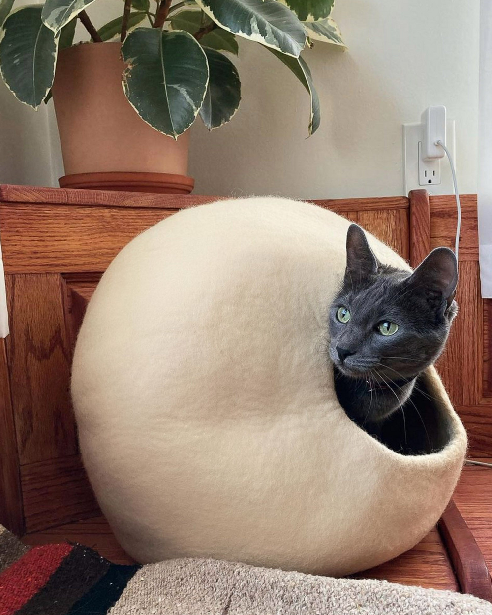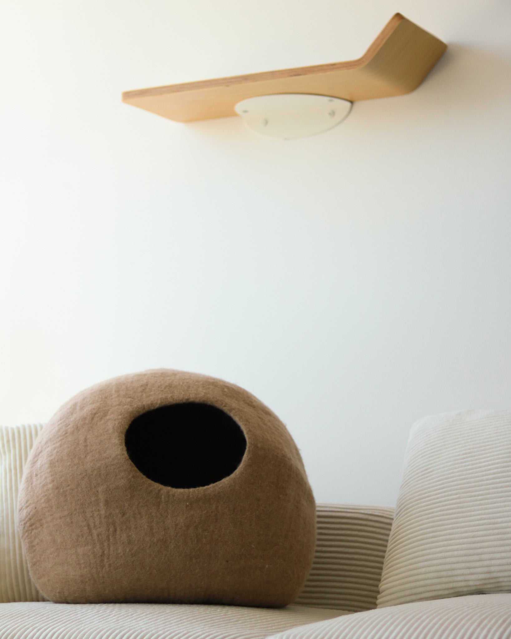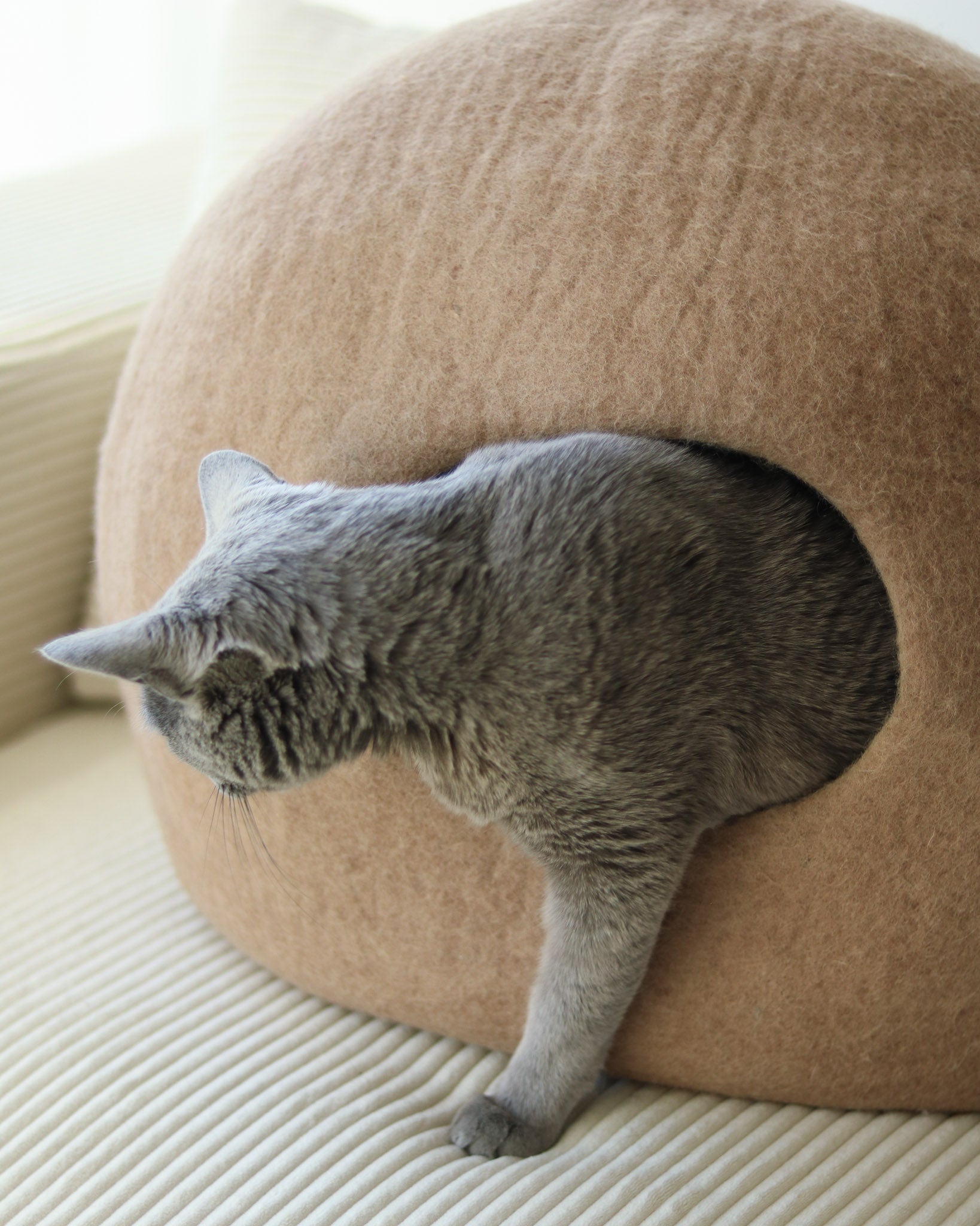 Paz Cat Cave is made from 100% Merino Wool, naturally resistant to odor and stains. These properties are due to the unique characteristics of its fibers, including an antibacterial lanolin coating. We recommend spot cleaning with soap and water if needed. Use a vacuum or lint roller for light cleans.