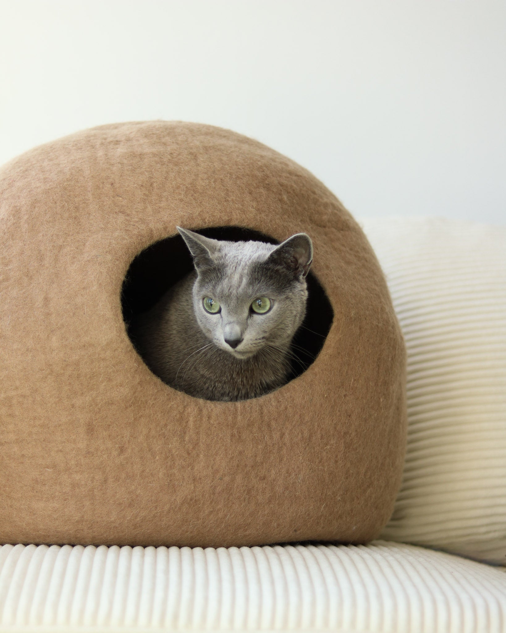 Paz Cat Cave is made from 100% Merino Wool, naturally resistant to odor and stains. These properties are due to the unique characteristics of its fibers, including an antibacterial lanolin coating. We recommend spot cleaning with soap and water if needed. Use a vacuum or lint roller for light cleans.